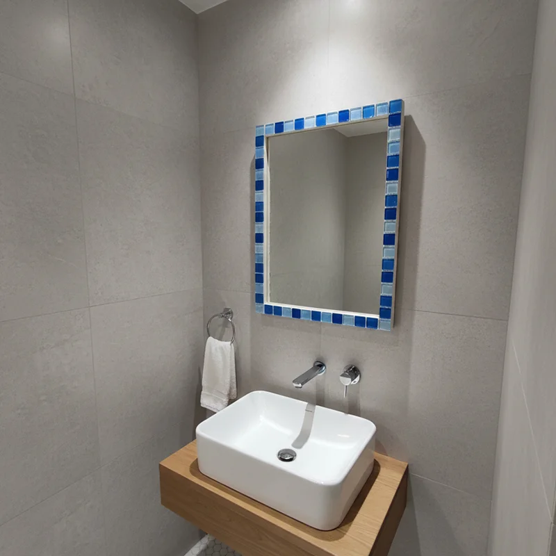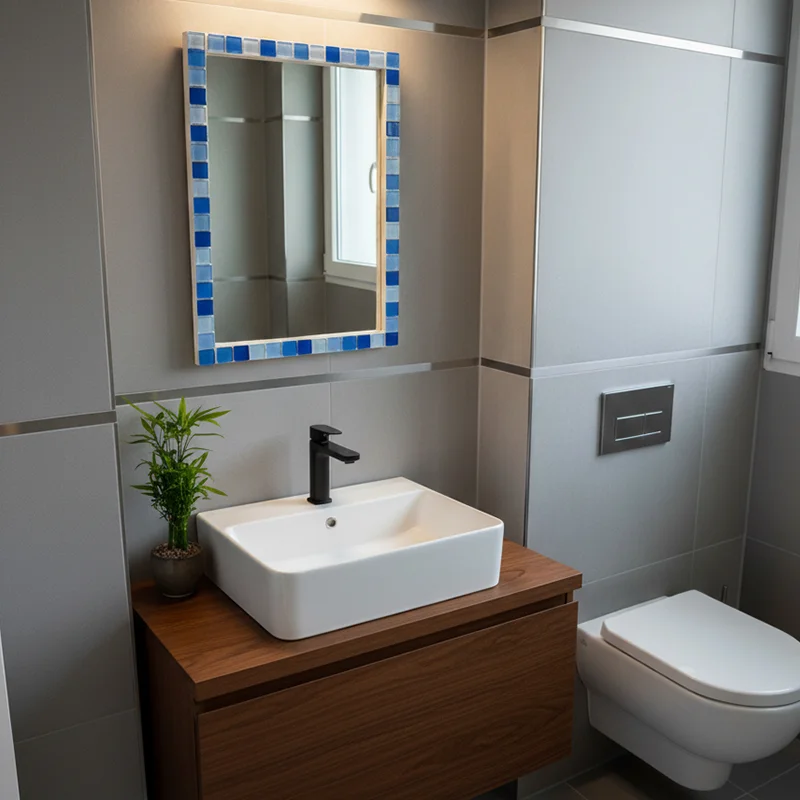 آینه سرویس بهداشتی دلفین مدل 1075-b با طراحی زیبا و مدرن، جلوهای خاص به فضای حمام و سرویس بهداشتی شما میبخشد. قاب این آینه با ترکیب سنگهای تزئینی مربعی در دو طیف رنگی آبی تیره و آبی روشن تزئین شده که جلوهای چشمنواز و آرامشبخش ایجاد میکند.ابعاد آینه ۵۱ سانتیمتر ارتفاع و ۳۶ سانتیمتر عرض دارد و برای استفاده در سرویسهای بهداشتی، روشوییها و فضاهای کوچک انتخابی ایدهآل است.