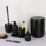 ست سرویس بهداشتی دکوراتیو دلفین از پلی رزین درجه یک ساخته شده است. ست دلفین تشکیل شده از، جای صابون، جای مسواک، سطل، توالتشور، جای مایع، و ظرف خشبوکننده به همراه سینی میباشد. از مزایای ست رومیزی دلفین ضد زنگ و ضد باکتری بودن است. ست دلفین با طراحی مینیمال مناسب برای هر دکوری میباشد. این محصول مناسب برای هدیه، جهیزیه و ایجاد یک دکور زیبا وایدهآل میباشد.