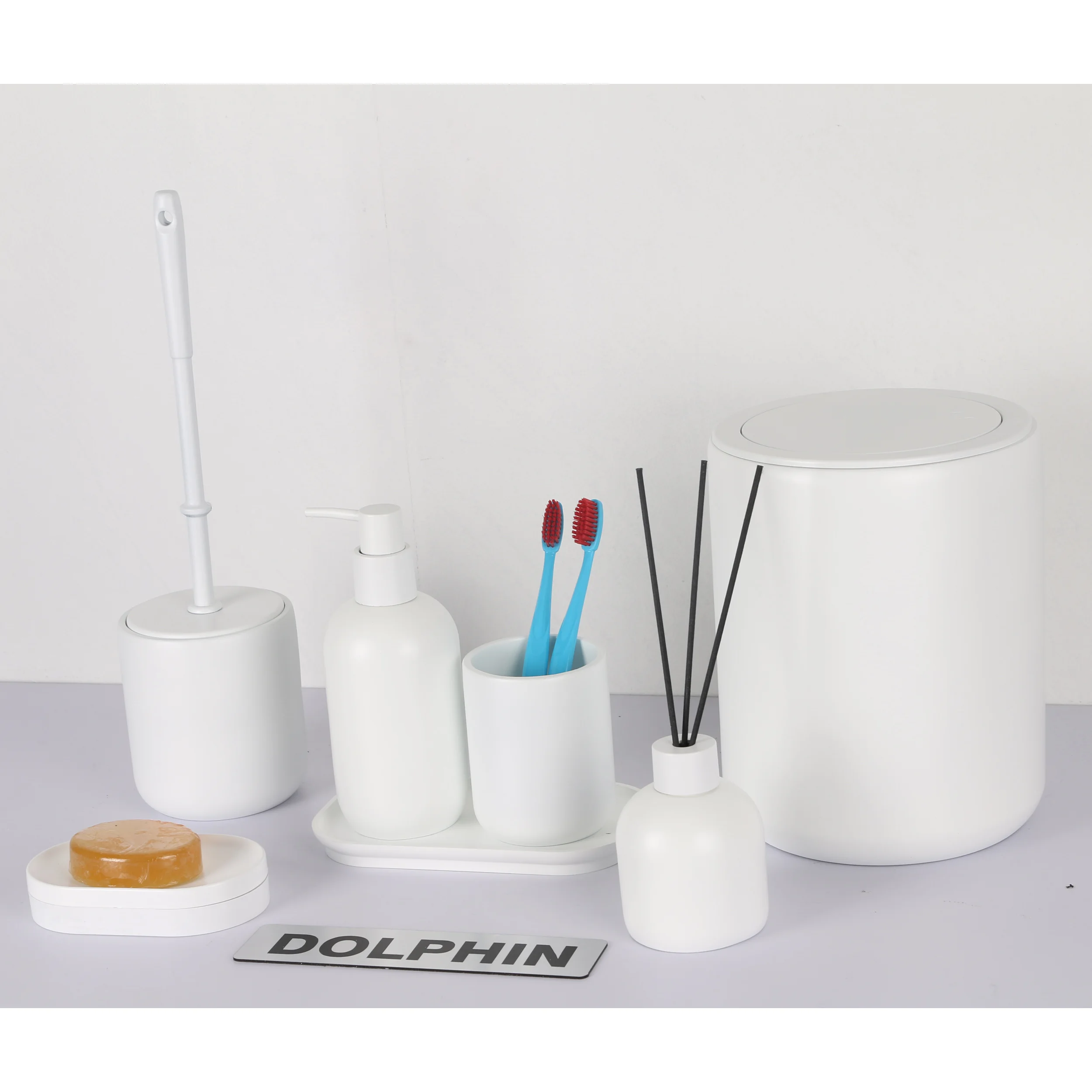 ست سرویس بهداشتی دکوراتیو دلفین از پلی رزین درجه یک ساخته شده است. ست دلفین تشکیل شده از، جای صابون، جای مسواک، سطل، توالتشور، جای مایع، و ظرف خشبوکننده به همراه سینی میباشد. ست رومیزی دلفین ضد زنگ و ضد باکتری است که مزیت بزرگی در سرویس بهداشتی است. طراحی مینیمال این محصول دلفین مناسب برای هر دکوری در سرویس بهداشتی میباشد. این محصول مناسب برای هدیه، جهیزیه و ایجاد یک دکور زیبا وایدهآل میباشد.