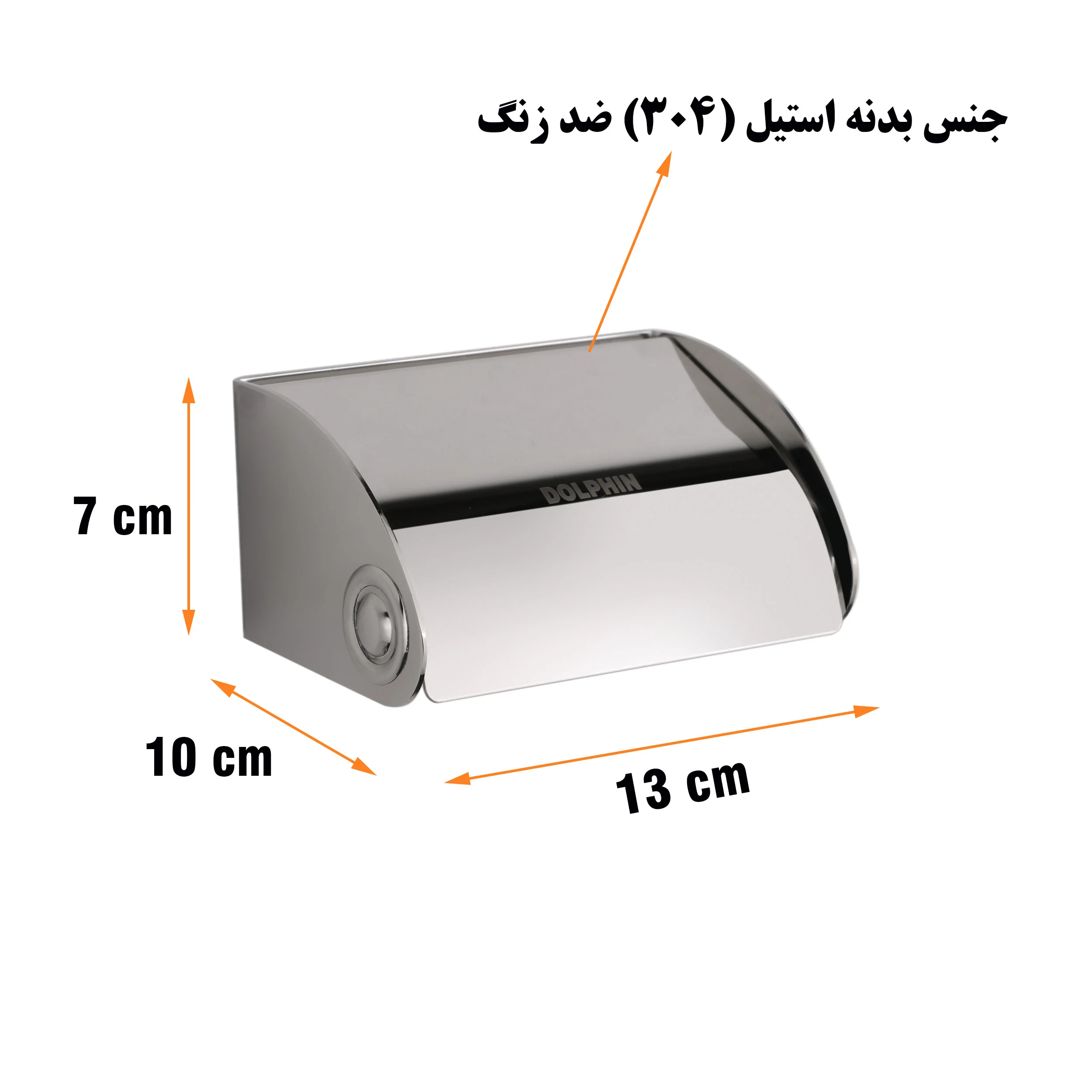 جنس پایه رول دستمال کاغذی دلفین مدل P061 از استیل ضدزنگ است. ابعاد این پایه رول دستمال کاغذی دلفین ۷*۱۰*۱۳ سانتی متر است.
