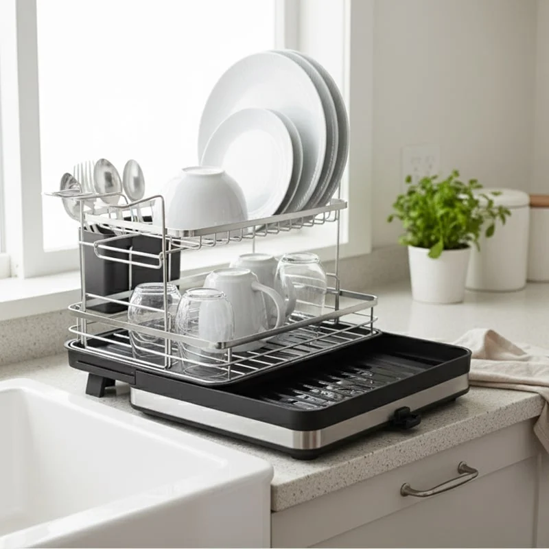 اگر دنبال یک آبچکان کاربردی و شیک برای آشپزخانهات هستی، آبچکان و جاظرفی دو طبقه دلفین (Dolphin) دقیقاً همون چیزیه که باید انتخاب کنی. طراحی دوطبقهی این محصول باعث میشه فضای بیشتری برای خشککردن ظروف داشته باشی، بدون اینکه شلوغی روی کابینت یا کنار سینک اذیتت کنه. طبقه بالا مخصوص بشقاب و درپوشهاست و طبقه پایین برای لیوان، کاسه و وسایل بزرگتر طراحی شده تا چینش مرتب و منظمتری به آشپزخونهت بده.