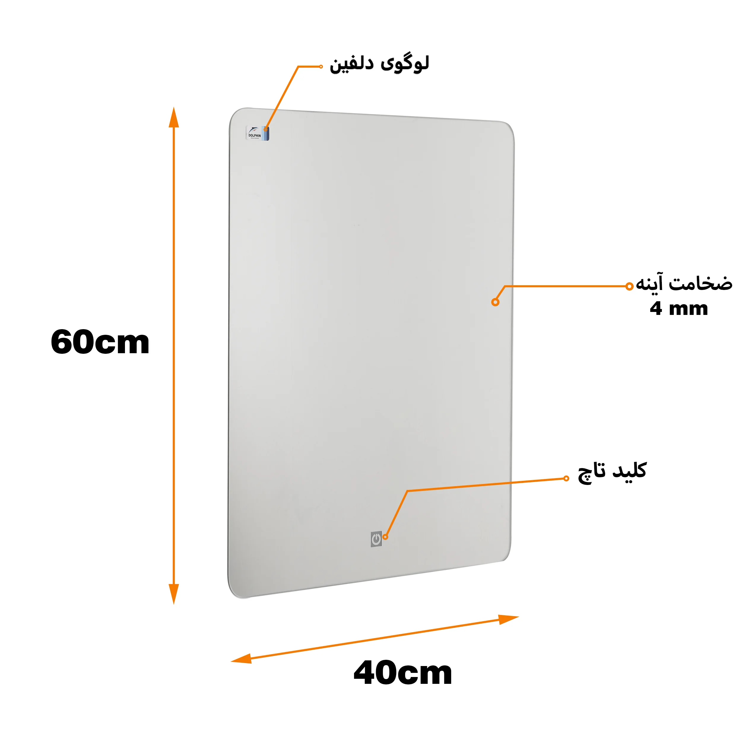 آینه دلفین مدل Touch-R-6040 در دسته آینه لمسی دلفین ایران قرار دارد. این محصول در دو رنگ نوری مهتابی و آفتابی قابل انتخاب میباشد. این آینه مستطیل شکل و کاربرد تزئینی و روزمره دارد. ابعاد این آینه 40*60 سانتیمتر است.