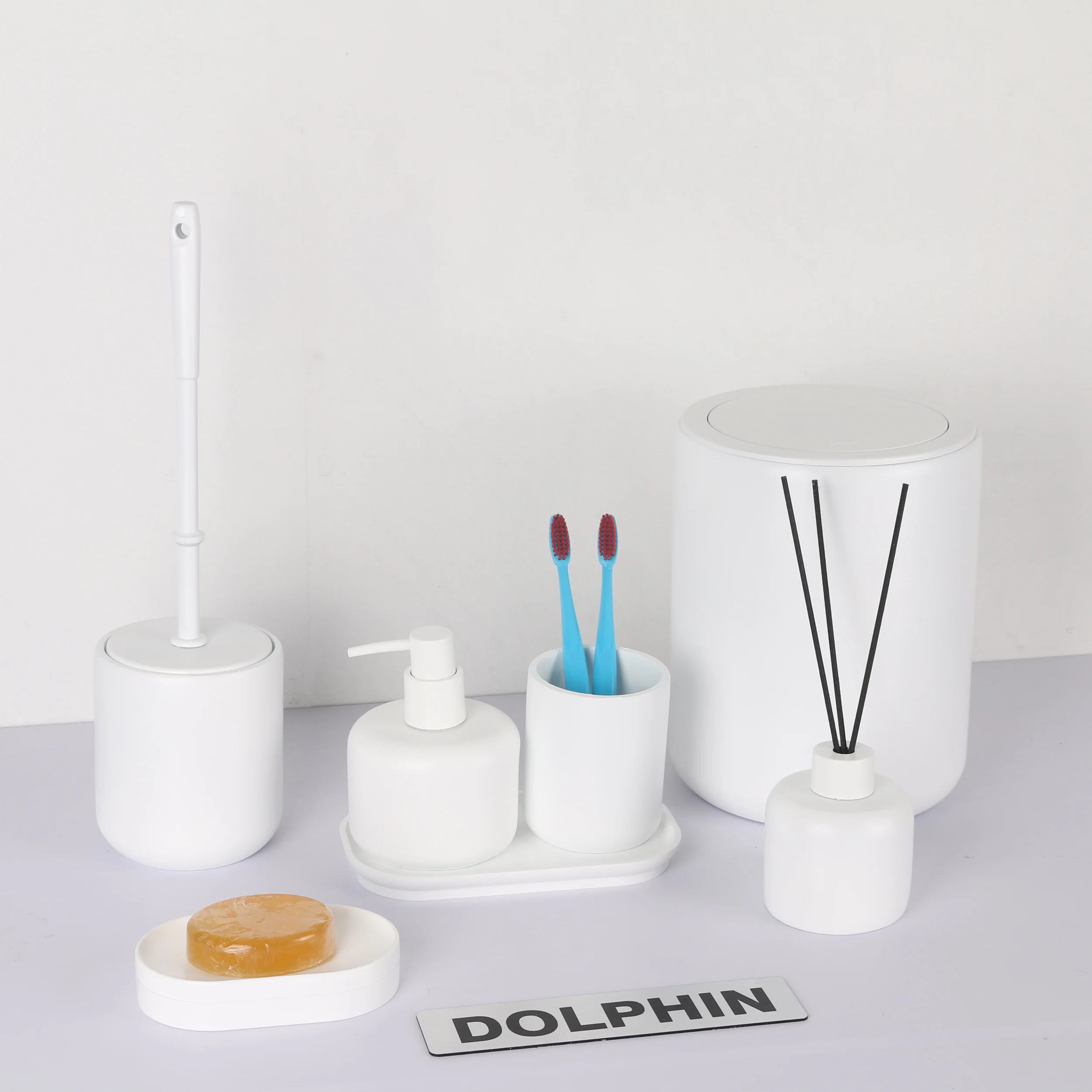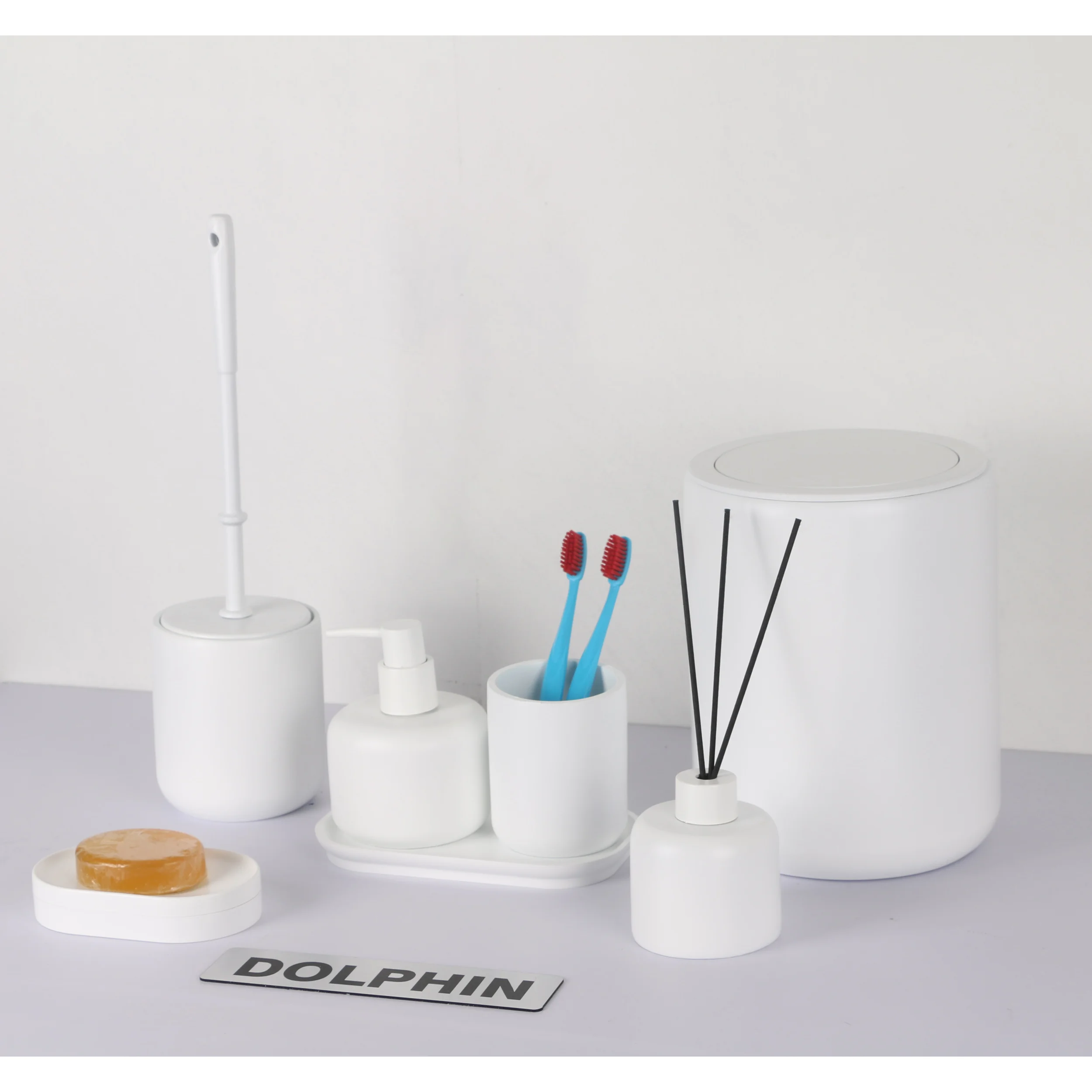 ست سرویس بهداشتی دکوراتیو دلفین از پلی رزین درجه یک ساخته شده است. ست دلفین تشکیل شده از، جای صابون، جای مسواک، سطل، توالتشور، جای مایع، و ظرف خشبوکننده به همراه سینی میباشد. ست رومیزی دلفین ضد زنگ و ضد باکتری است که مزیت بزرگی در سرویس بهداشتی است. طراحی مینیمال این محصول دلفین مناسب برای هر دکوری در سرویس بهداشتی میباشد. این محصول مناسب برای هدیه، جهیزیه و ایجاد یک دکور زیبا وایدهآل میباشد.