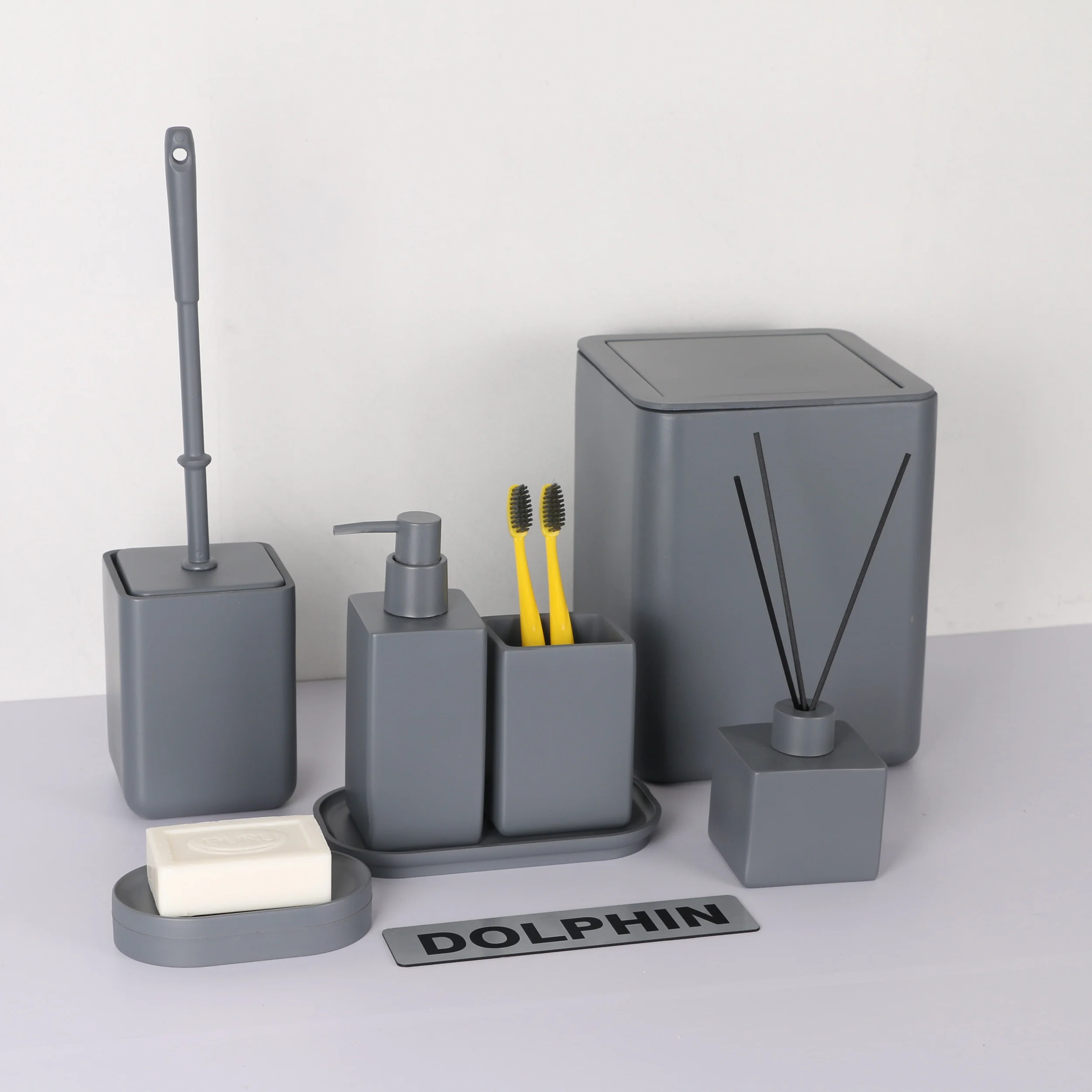 ست سرویس بهداشتی دکوراتیو دلفین از پلی رزین درجه یک ساخته شده است. ست دلفین تشکیل شده از، جای صابون، جای مسواک، سطل، توالتشور، جای مایع، و ظرف خشبوکننده به همراه سینی میباشد. ست رومیزی دلفین ضد زنگ و ضد باکتری است که مزیت بزرگی در سرویس بهداشتی است. طراحی مینیمال این محصول دلفین مناسب برای هر دکوری در سرویس بهداشتی میباشد. این محصول مناسب برای هدیه، جهیزیه و ایجاد یک دکور زیبا وایدهآل میباشد.