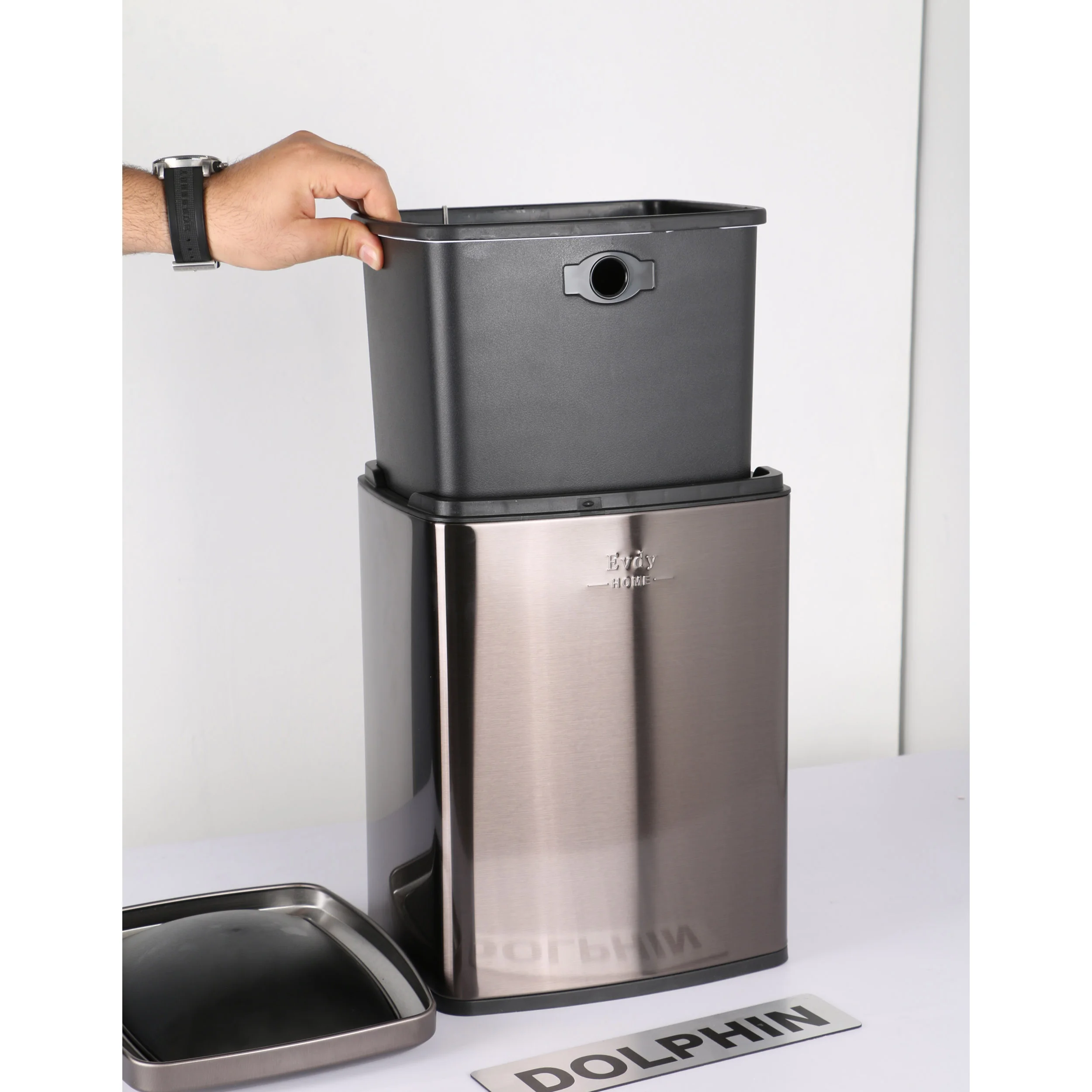 سطل دلفین مدل EV-12-ltr. این محصول ساخته شده از استیل ضد زنگ بوده که مناسب برای فضاهای رطوبتی می‌باشد. درب سطل بصورت بادبزنی می باشد که بسیار محکم هستند و طول عمر بالایی دارند. همچنین سطل داخلی قابل بیرون آوردن است تا تخلیه و شستشوی سطل آسان باشد. سطل 12 لیتر در سه رنگ موجود می باشد.